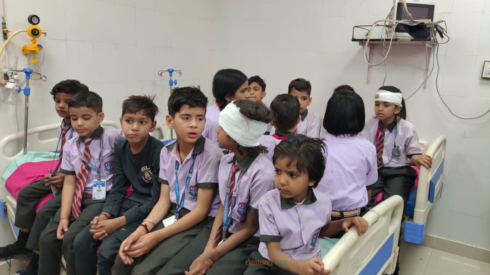 निजी स्कूल की दो बसों में टक्कर,36 बच्चे घायल:ओवरटेक करने के चक्कर में पलटी; सिर और मुंह पर लगी चोट