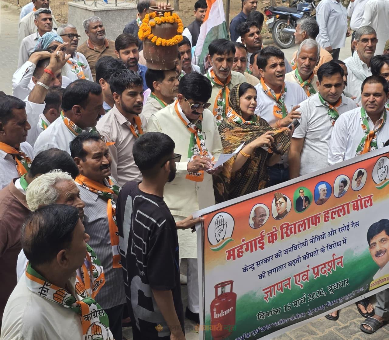 सूरजगढ़ : बढ़ती महंगाई और रसोई गैस सिलेंडर के दामों में वृद्धि के विरोध में ब्लॉक एवं शहर कांग्रेस कमेटी, सूरजगढ़ के तत्वावधान में विधायक श्रवण कुमार के नेतृत्व में कांग्रेस कार्यकर्ताओं ने प्रदर्शन कर उपखंड अधिकारी को ज्ञापन सौंपा। धरना-प्रदर्शन को संबोधित करते हुए विधायक श्रवण कुमार ने कहा कि लगातार बढ़ती महंगाई से आम जनता परेशान है और भाजपा सरकार की नीतियों के कारण लोगों की कमर टूट चुकी है। उन्होंने आरोप लगाया कि खाद्य सामग्री सहित आवश्यक वस्तुओं के दाम लगातार बढ़ रहे हैं, जिससे आम आदमी का जीवन प्रभावित हो रहा है।