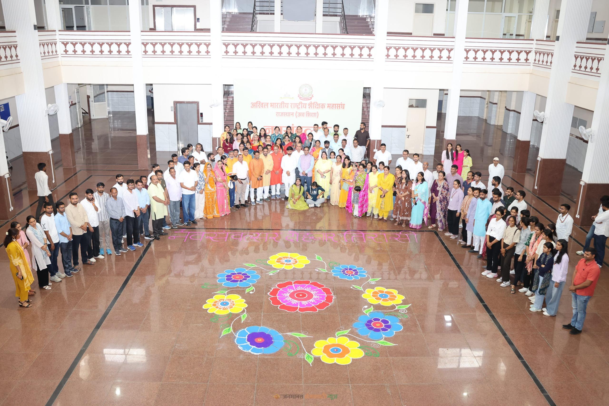 इस अवसर पर विभिन्न संकायों के डीन—प्रो. मंजू लाडला, प्रो. भंवरलाल, प्रो. मनोज झांझडिया एवं प्रो. सुशीला चौधरी सहित बड़ी संख्या में शिक्षक एवं विद्यार्थी उपस्थित रहे। कार्यक्रम के दौरान पारंपरिक तिलकार्चन के पश्चात कुलगुरु एवं अन्य अतिथियों को विद्यार्थियों ने हिंदू नववर्ष एवं नवसंवत्सर की शुभकामनाएं और बधाई दीं। कार्यक्रम में छात्राओं ने नवसंवत्सर को उकेरते हुए आकर्षक रंगोली भी बनाई। अंत में सभी विद्यार्थियों एवं फैकल्टी सदस्यों को मिठाई वितरित कर कार्यक्रम का समापन किया गया।