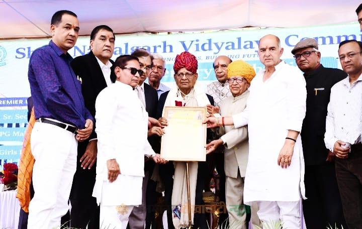 नवलगढ़ : नवलगढ विद्यालय कमेटी के 125 वर्ष पूर्ण होने पर भव्य समारोह में एसएन बीएड काॅलेज प्रांगण में नवलगढ की सामाजिक संस्था संजीवनी द्वारा शिक्षा के लिए समर्पित समाजसेवी बनवारी लाल जालान का प्रशस्ती पत्र, माला, शाॅल, साफा व प्रतीक चिन्ह देकर सम्मान किया गया। प्रशस्ती पत्र का वाचन संजीवनी के सचिव डाॅ अनिल कुमार शर्मा द्वारा किया गया।