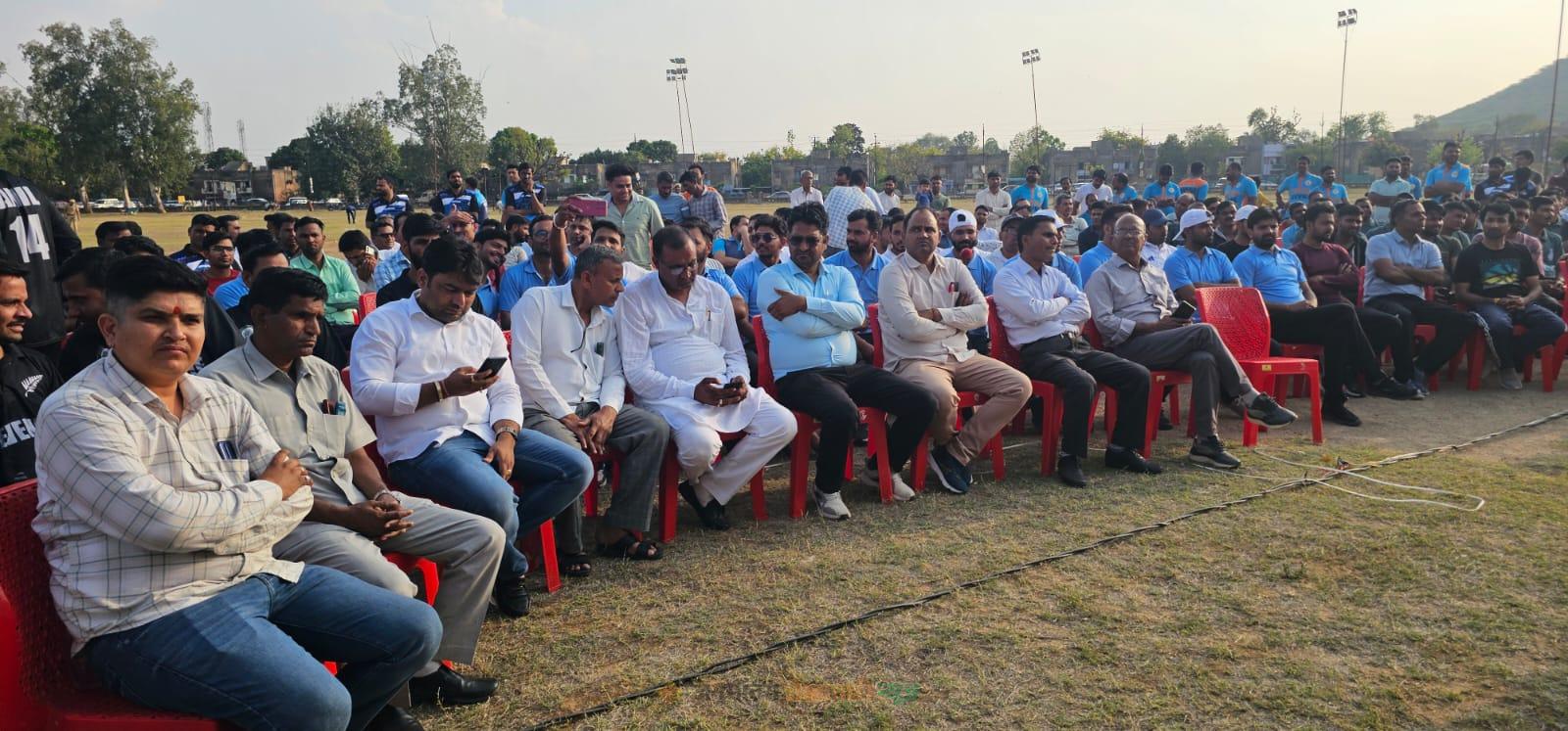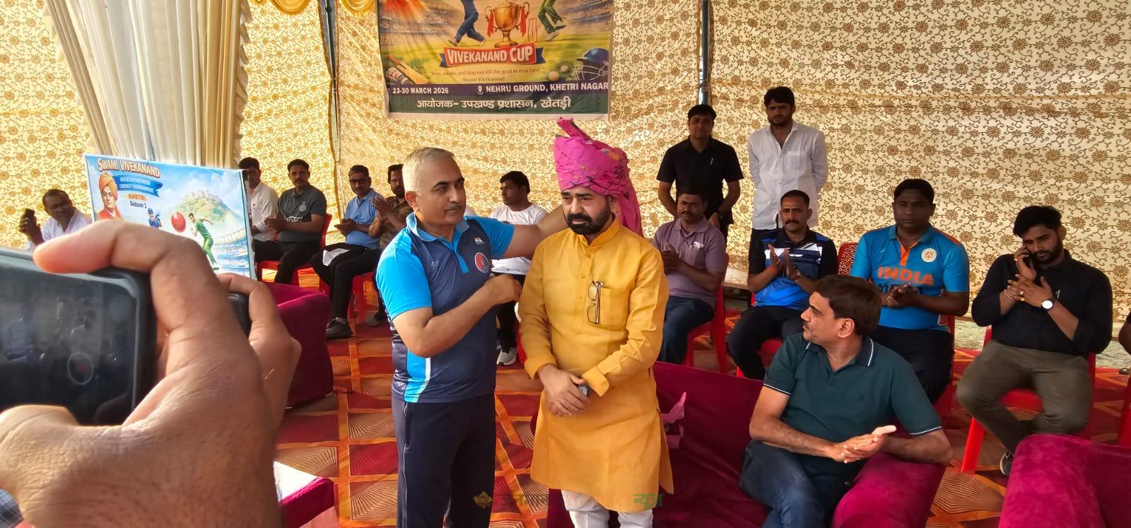 खेतड़ी नगर : केसीसी के नेहरू मैदान में सोमवार शाम स्वामी विवेकानंद इंटर डिपार्मेंट डे-नाइट टेनिस बॉल क्रिकेट प्रतियोगिता का भव्य शुभारंभ हुआ। कार्यक्रम के मुख्य अतिथि विधायक इंजीनियर धर्मपाल गुर्जर रहे, जबकि अध्यक्षता जिला कलेक्टर डॉ. अरुण गर्ग ने की। विशिष्ट अतिथि के रूप में एसडीएम सुनील चौहान, डीएसपी जुल्फिकार अली, तहसीलदार सुनील कुमार, समाजसेवी हरिराम गुर्जर, पूर्व प्रधान मदनलाल गुर्जर व रोहितास मनकस उपस्थित रहे।