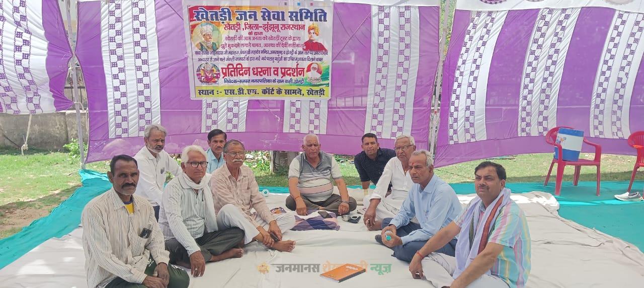 खेतड़ी : खेतड़ी एसडीएम कार्यालय के सामने जन सेवा समिति के बैनर तले चल रहा धरना शनिवार को दसवें दिन भी जारी रहा। गोकुलचंद सैनी के नेतृत्व में ग्रामीण अपनी विभिन्न मांगों को लेकर प्रशासन के खिलाफ विरोध प्रदर्शन कर रहे हैं। प्रदर्शनकारियों ने ट्रस्ट के प्रबंधन के खिलाफ नारेबाजी की और अनिश्चितकालीन आंदोलन जारी रखने की चेतावनी दी।