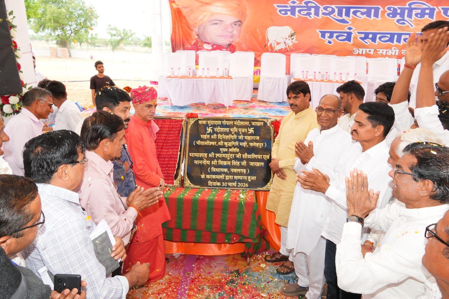 नवलगढ़ : बाबा सुंदरदास गोपाल नंदीशाला, जाखल में नंदीशाला विकास कार्यों हेतु भूमि पूजन एवं सवामणी प्रसाद कार्यक्रम श्रद्धा एवं उत्साह के साथ सम्पन्न हुआ। कार्यक्रम में संत शिरोमणि महंत दिनेशगिरी महाराज फतेहपुर मढ़ी के सानिध्य में विधि-विधान से भूमि पूजन किया गया। इस अवसर पर नंदीशाला के लिए भूमि दान करने वाले भामाशाह रामजीलाल मूंड एवं उनके परिवार का साफा एवं माल्यार्पण कर सम्मान किया गया। कार्यक्रम में नवलगढ़ विधायक विक्रम सिंह जाखल ने भी शिरकत की। उन्होंने नंदीशाला परिसर में लगभग 400 मीटर सीसी रोड बनवाने तथा गौसेवा हेतु 1 लाख रुपये की सहयोग राशि देने की घोषणा की।