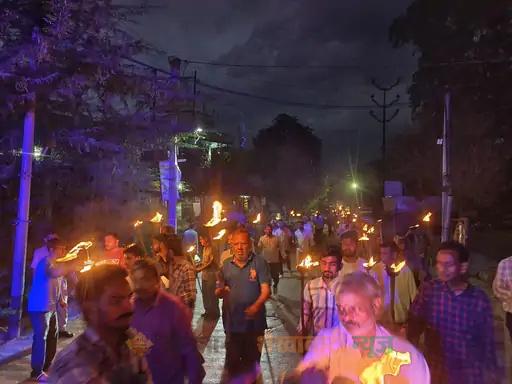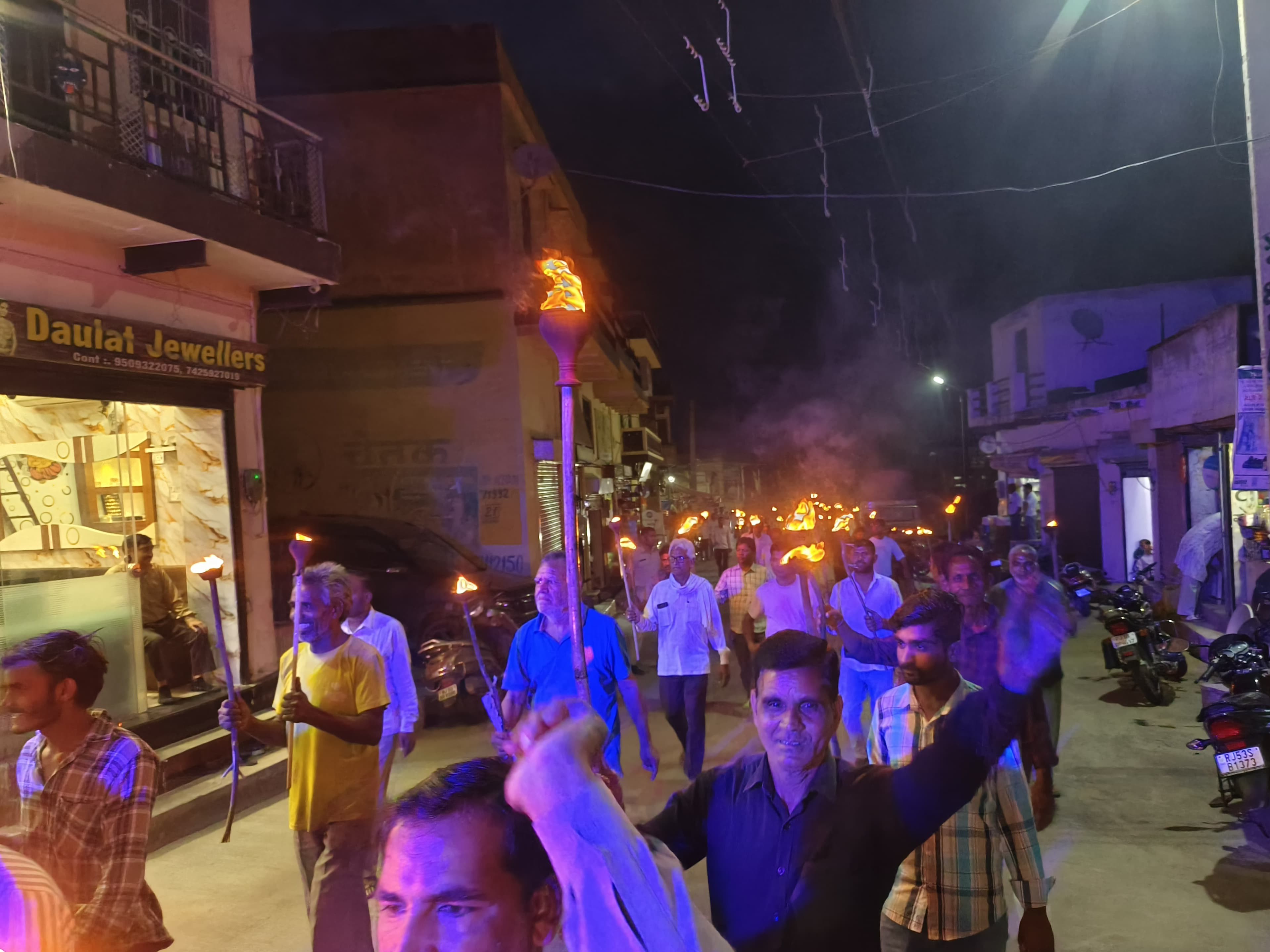 भोपालगढ़ किले पर गेट लगाने का विरोध, मशाल जुलूस निकाला:ग्रामीणों ने आंदोलन तेज करने का लिया निर्णय, 13 दिन से धरना जारी