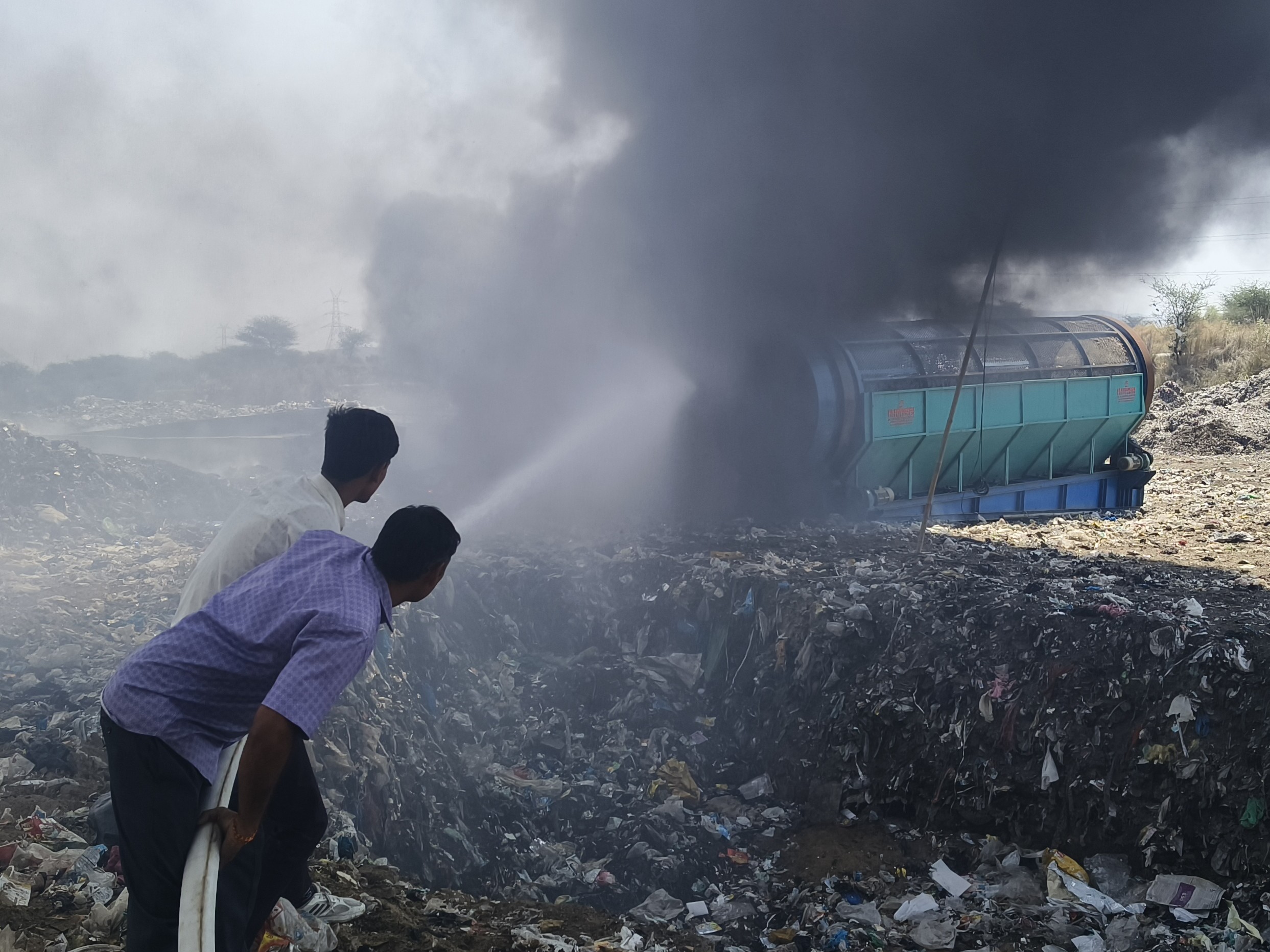 नीमकाथाना में कचरा डंपिंग यार्ड में लगी आग:कम्पोस्टिंग मशीनें चपेट में आई, दो पूरी तरह जली