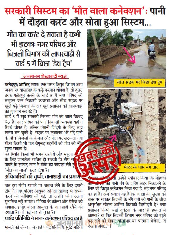 फतेहपुर : वार्ड संख्या 5 में “मौत वाला कनेक्शन” बन चुकी स्थिति पर आखिरकार प्रशासन की नींद टूट गई। जन मानस में प्रकाशित खबर के बाद नगर परिषद और विद्युत विभाग हरकत में आए और मौके पर फैले खतरे को काफी हद तक खत्म कर दिया गया। जिस स्थान पर पहले सड़क पर भरे गंदे पानी के बीच बिजली के नंगे तार और असुरक्षित मीटर जानलेवा स्थिति पैदा कर रहे थे, वहां अब पानी की निकासी कर दी गई है और खुले तारों को समेट लिया गया है। क्षेत्र में तत्काल सुधार के बाद स्थानीय लोगों ने राहत की सांस ली है।