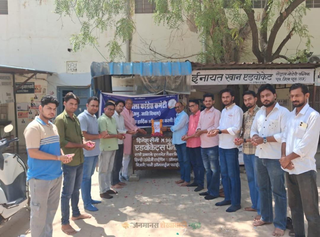 चूरू : जिला मुख्यालय पर राजस्थान प्रदेश कांग्रेस कमेटी (अनु. जाति विभाग) के निर्देशानुसार चुरु जिला कांग्रेस कमेटी अनु. जाति विभाग की और से पुर्व उप प्रधानमंत्री स्वर्गीय बाबु जगजीवनराम की जयंती के अवसर पर श्रृद्धांजलि कार्यक्रम का आयोजन किया गया। इस अवसर पर चुरु जिला कांग्रेस कमेटी अनु जाति विभाग के जिला अध्यक्ष एडवोकेट सुरेश कुमार कल्ला ने कहा कि स्वर्गीय बाबु जगजीवनराम का देश के प्रति उनके अदित्य योगदान को याद किया गया तथा यह संकल्प लिया गया कि जिस तरह से स्वर्गीय बाबु जगजीवनराम ने विपरीत परिस्थितियों में देश व समाज को एक नई दिशा देने का काम किया है हम सब भी उनके पद चिन्हों पर चलकर राष्ट्र निर्माण में अपना योगदान प्रदान करेंगे। इस अवसर पर चुरु जिला कांग्रेस कमेटी प्रदेश उपाध्यक्ष एडवोकेट सुनील मेघवाल, जिला अध्यक्ष एडवोकेट सुरेश कुमार कल्ला, एडवोकेट सद्दाम हुसैन, रामकुमार मेहरा,अनिस खान,चन्दन खारड़िया, सुरेन्द्र बरोड़, कन्हैयालाल, महेश मेहरा आदि उपस्थित रहे।