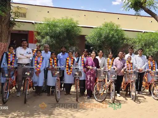 सांडवा : सांडवा के पीएमश्री लक्ष्मी नारायण तापड़िया राजकीय उच्च माध्यमिक विद्यालय में सोमवार को कक्षा 9 की 72 बालिकाओं को राज्य सरकार की योजना के तहत निःशुल्क साइकिलें वितरित की गईं। इसी कार्यक्रम में बोर्ड परीक्षा सत्र 2025-26 में उत्कृष्ट प्रदर्शन करने वाले 32 मेधावी छात्र-छात्राओं को साफा और माला पहनाकर सम्मानित किया गया।