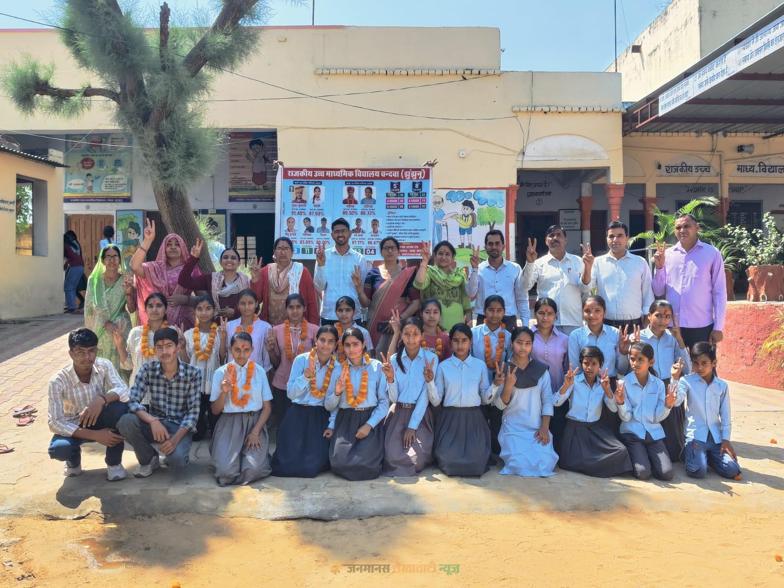बिसाऊ : कस्बे के निकटवर्ती ग्रांम चंदवा के राजकीय उच्च माध्यमिक विद्यालय प्रांगण में सोमवार को कार्यवाहक प्रधानाचार्य अंजू कुमारी की अध्यक्षता में शानदार बोर्ड परिक्षा परिणाम के उपलक्ष्य में कार्यक्रम आयोजित किया गया। जिसमें विधालय के कक्षा पांचवी आठवीं, दसवीं तथा बारहवीं बोर्ड परीक्षाओं में उत्कृष्ट परिणाम देने वाले सभी होनहार बच्चों को माला पहनाकर व तिलक लगाकर सम्मान किया गया। उन्होंने बताया कि बोर्ड की सभी परीक्षाओं का परिणाम शत् प्रतिशत रहा है। तत्पश्चात प्रवेशोत्सव कार्यक्रम के तहत विद्यालय के अटैचमैंट एरिया में पंपलेट, बैनर व पोस्टर सहित रैली निकाली गई। जिसमें विद्यालय के समस्त स्टाफ व ग्रामीणों ने भरपूर सहयोग किया। कार्यवाहक प्रधानाचार्य अंजू कुमारी ने सहयोग के लिए सभी ग्रामीण जनो का आभार धन्यवाद ज्ञापित किया।