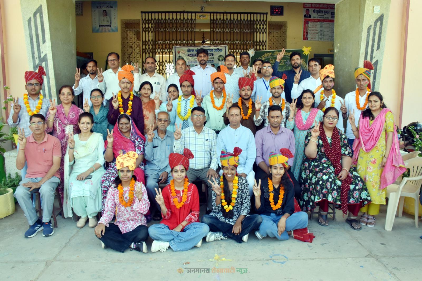 बिसाऊ : सेठ दुर्गादत जटीया राजकीय उच्च माध्यमिक विद्यालय बिसाऊ का 10वीं व 12वीं बोर्ड परीक्षाओं में शानदार परीक्षा परिणाम रहने के उपलक्ष्य में विजय रैली निकाली गई। रैली से पूर्व 90% से अधिक अंक प्राप्त करने वाले 10वीं तथा 12वीं कक्षा के सभी छात्र-छात्राओं का माला पहनाकर, तिलक लगाकर व सफा पहनाकर अभिभावकों के साथ सम्मान किया गया। वाणिज्य वर्ग में जयप्रकाश सैनी ने 90% , विज्ञान वर्ग में लकी जोशी ने 91.80%, खुशी सैनी ने 91.60% तथा कला वर्ग में अंकित में 91.80% और राजवीर सिंह ने 90.60% और कक्षा दसवीं में राबिया कुरैशी ने 93.50% अंक प्राप्त कर विद्यालय का नाम रोशन किया है।