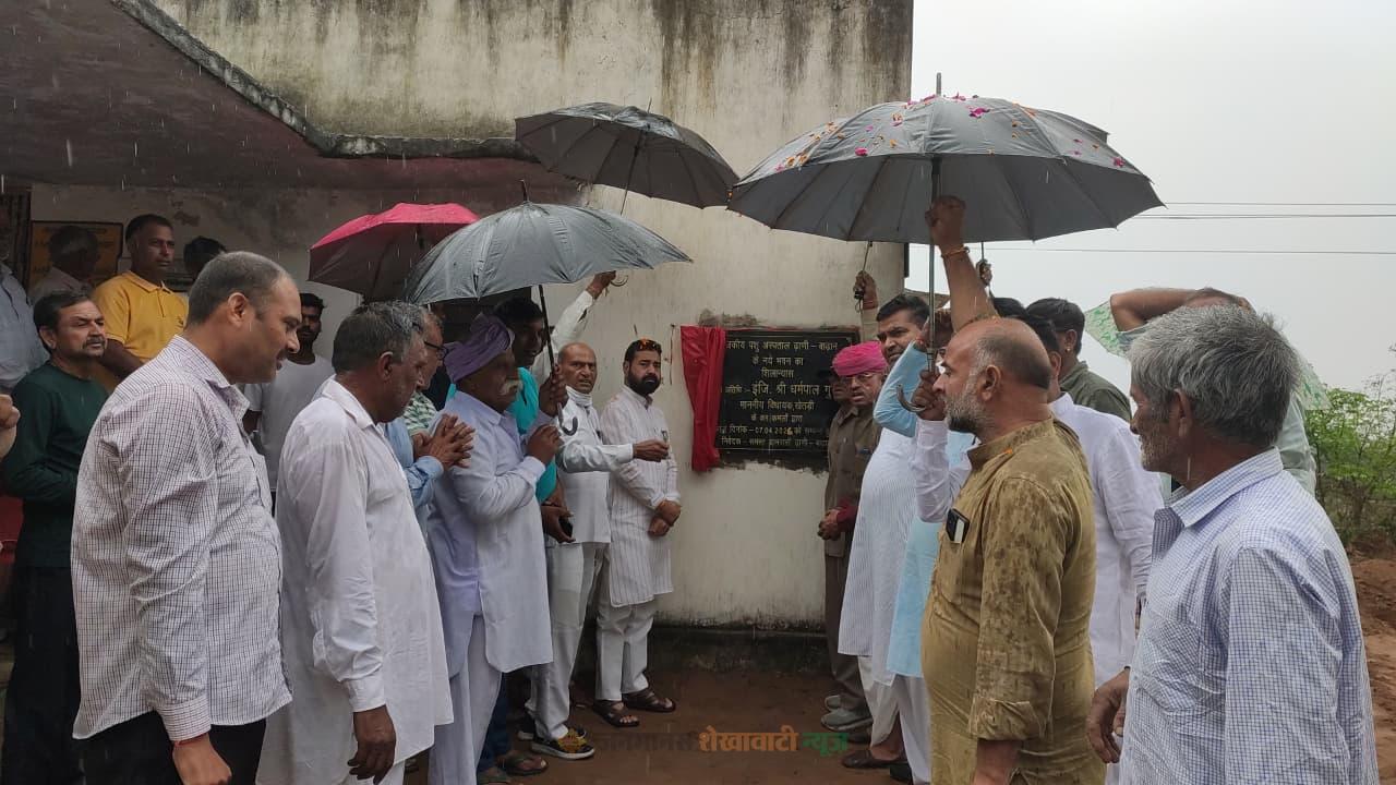 खेतड़ी : उपखंड क्षेत्र के ढाणी बाढ़ान गांव में राजकीय पशु अस्पताल भवन का शिलान्यास समारोह आयोजित हुआ, जिसमें क्षेत्रीय विकास की दिशा में एक और महत्वपूर्ण कदम उठाया गया। इस अवसर पर विधायक धर्मपाल गुर्जर का नागरिक अभिनंदन भी किया गया। कार्यक्रम की अध्यक्षता विक्रम सिंह शेखावत ने की, जबकि मुख्य अतिथि के रूप में विधायक धर्मपाल गुर्जर मौजूद रहे।समारोह के दौरान विधायक धर्मपाल गुर्जर ने 46.50 लाख रुपये की लागत से बनने वाले राजकीय पशु अस्पताल भवन का विधिवत शिलान्यास किया। इसके बाद ढाणी बाढ़ान को ग्राम पंचायत का दर्जा मिलने की खुशी में ग्रामीणों ने उनका भव्य स्वागत किया। ग्रामीणों ने साफा व माला पहनाकर सम्मानित किया, जिसमें विशेष रूप से 51 किलो की माला पहनाई गई और परंपरागत रूप से तलवार भेंट कर सम्मान किया गया।