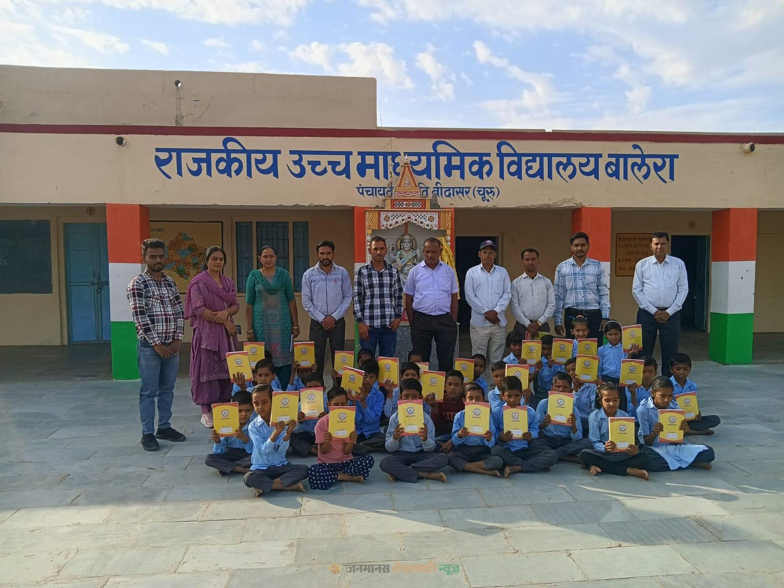 बीदासर : क्षेत्र के बालेरा स्थित राजकीय उच्च माध्यमिक विद्यालय में सुप्रीम फाउंडेशन जसवंतगढ़ की ओर से कक्षा 1 से 5 तक के विद्यार्थियों को निःशुल्क नोटबुक्स वितरित की गईं। इस पहल से नन्हे विद्यार्थियों के चेहरे खुशी से खिल उठे। कार्यक्रम के दौरान सुप्रीम फाउंडेशन के मुख्य ट्रस्टी स्व.बजरंग लाल तापड़िया एवं महावीर प्रसाद तापड़िया के प्रति विशेष आभार व्यक्त किया गया। साथ ही फाउंडेशन के प्रिंसिपल कोऑर्डिनेटर श्यामबाबू शर्मा, बीदासर तहसील कोऑर्डिनेटर दीपक कौशिक एवं योगेश कुमार सिंगोदिया का भी धन्यवाद ज्ञापित किया गया। विद्यालय के संस्था प्रधान राकेश सहित समस्त विद्यालय परिवार ने सुप्रीम फाउंडेशन के इस सराहनीय सहयोग के लिए आभार व्यक्त किया। इस अवसर पर स्वयंसेवक मनोज, गुलजार, श्रीराम, कैलाश, अनीता सहित विधालय के अनेक विद्यार्थी उपस्थित रहे।