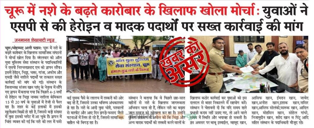 चूरू : जिला पुलिस अधीक्षक चूरू निश्चय प्रसाद एम. आई.पी.एस ने बताया कि चूरू शहर में आजकल ड्रग्स (चिट्टा, एमडी) का प्रभाव बढ रहा है जिससे स्कूल कॉलेज में पढने वाले नवयुवक नशे की चपेट में आ रहे है तथा नशा प्राप्त करने के लिए अवैध कार्यों को बढावा मिल रहा है। स्कूल कॉलेज में पढने वाले नवयुवक जो चिट्टा, एम. डी. का सेवन कर रहें है जिससे उनका भविष्य खराब हो रहा है एवम् उनके माता-पिता भी इस कारण तनाव में रहते हैं।