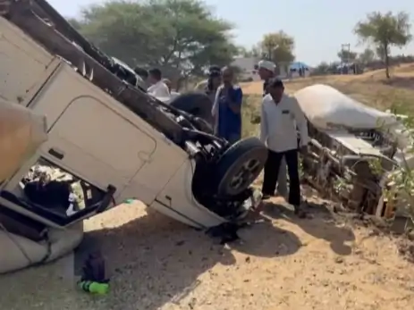सरदारशहर पुलासर के पास दो पिकअप भिड़ीं:ओवरटेक के दौरान दोनों पलटीं, बड़ा हादसा टला