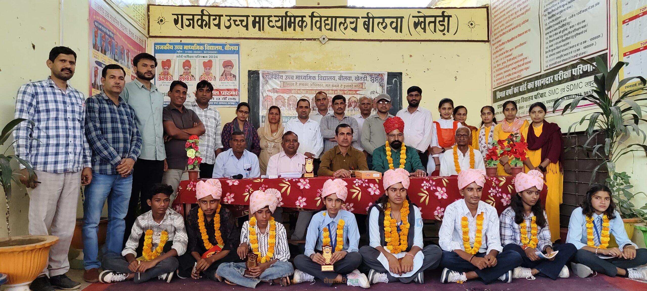 खेतड़ी : राजकीय उच्च माध्यमिक विद्यालय, बीलवा में माध्यमिक शिक्षा बोर्ड परीक्षा 2026 में उत्कृष्ट प्रदर्शन करने वाले छात्र-छात्राओं का सम्मान किया गया। कार्यक्रम में मुख्य अतिथि सूबेदार मेजर गंगाराम रहे, जबकि अध्यक्षता प्रधानाचार्य डॉ. चरण सिंह ने की।