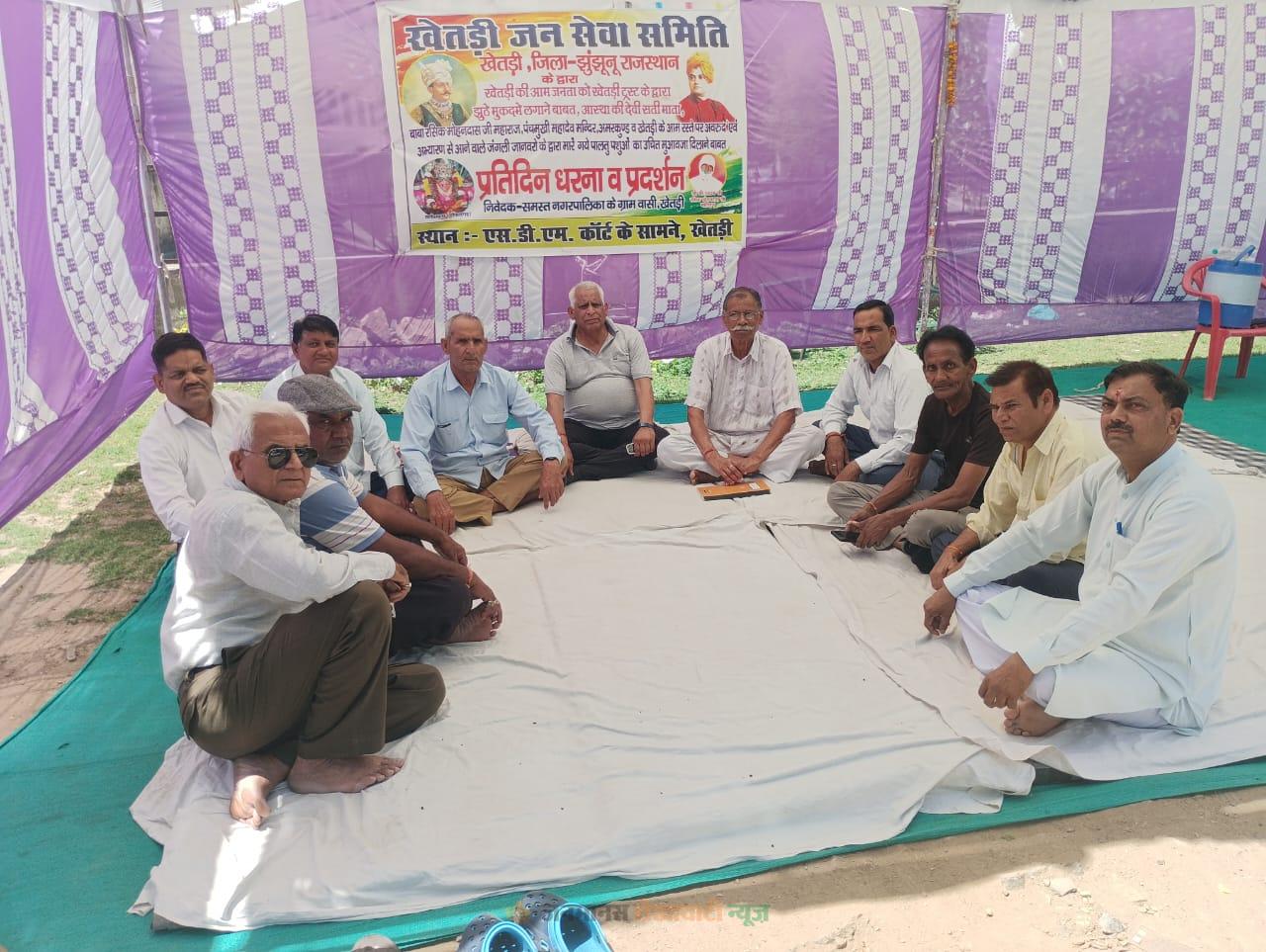 खेतड़ी में जन सेवा समिति का धरना 26वें दिन जारी: मांगों पर कार्रवाई नहीं होने से बढ़ा आक्रोश, आज धरना स्थल पर मनाई जाएगी अंबेडकर जयंती