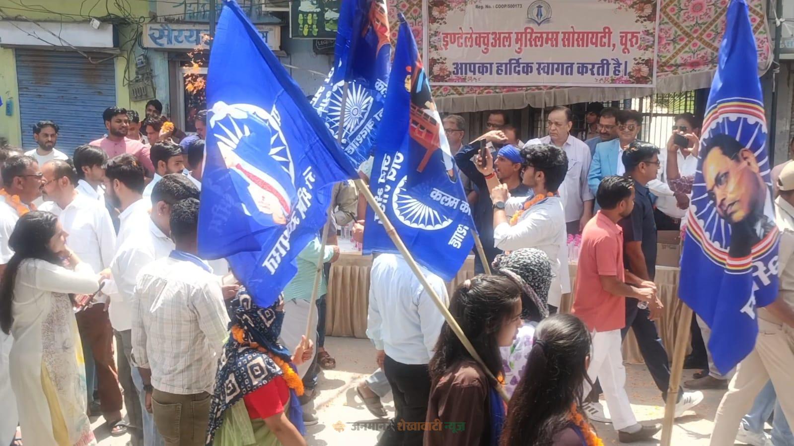 चूरू : जिला मुख्यालय पर आज डॉक्टर भीमराव आंबेडकर की 135 वीं जयंती के मौके पर, इंटेलेक्चुअल मुस्लिम सोसायटी, चूरू द्वारा डॉक्टर मुमताज हॉस्पिटल के आगे डॉ भीमराव अंबेडकर रैली का दिल की गहराइयों से स्वागत किया गया। पुष्प वर्षा कर और पानी पिलाकर जो इज्ज़त अफ़ज़ाई की गई, जिससे रैली के आयोजकों ने धन्यवाद दिया । रेली गढ़ चौराहे से रवाना होकर सफेद घंटाघर, सुभाष चौक, डॉक्टर मुमताज हॉस्पिटल,नई सड़क, रेलवे स्टेशन, होते हुए जिला कलेक्टर डॉ भीमराव अंबेडकर मूर्ति तक पहुंची जो शहर के मुख्य मार्गो से होते हुए।