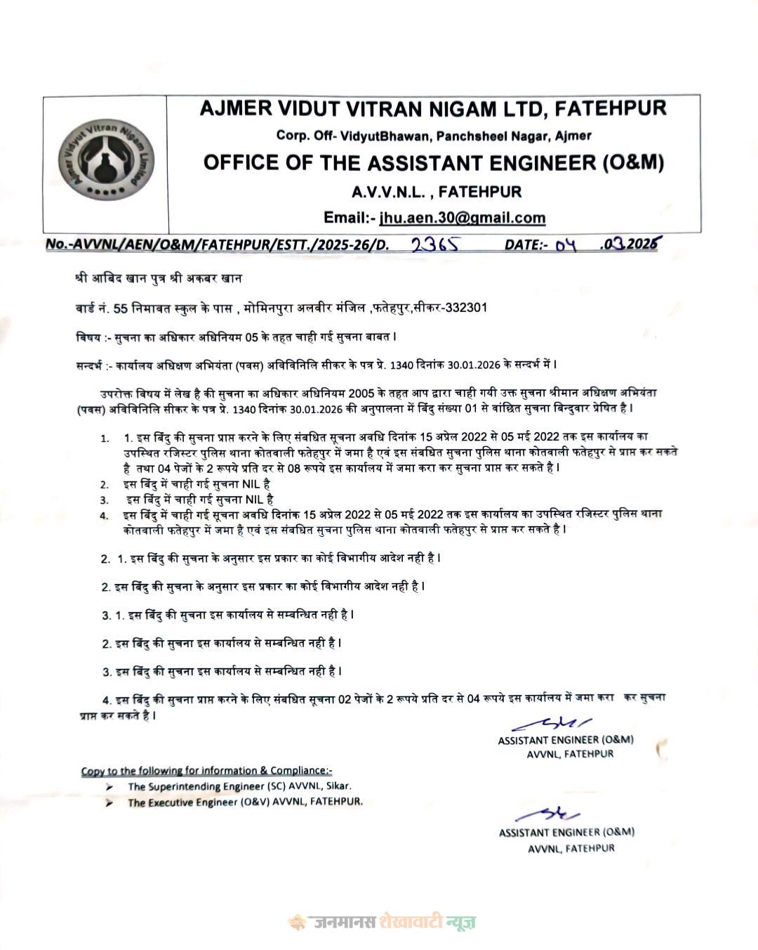 ”यह मामला सुनकर अफसोस हुआ हैं। हमारे यहां ये सब भी चल रहा हैं क्या आपके पास जो भी एविडेंस हैं वो मुझे व्हाट्सएप या मेल पर उपलब्ध करवाए सभी पूर्व की खबरों की प्रतियां उपलब्ध करवाए मैं विशेष उच्च स्तरीय टीम बनाकर जांच करवाता हूं दोषियों को किसी भी हाल में माफ नही किया जाएगा” – सीशराम वर्मा, संभागीय मुख्य अभियंता (Chief Engineer) झुंझुनूं