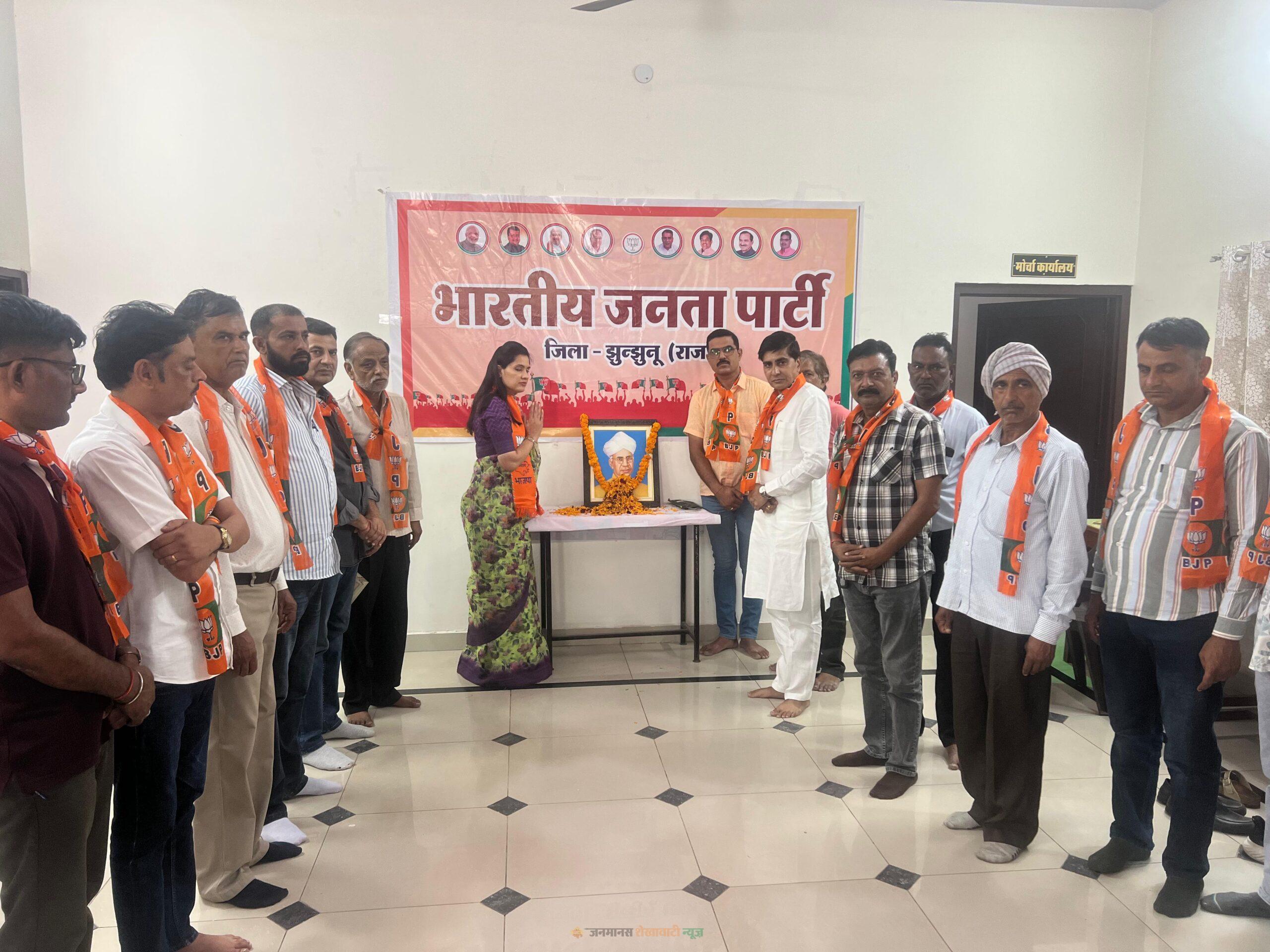 झुंझुनूं : भारत के प्रथम उपराष्ट्रपति एवं द्वितीय राष्ट्रपति रहे सर्वपल्ली राधाकृष्णन की पुण्यतिथि पर भाजपा जिला कार्यालय में श्रद्धांजलि कार्यक्रम आयोजित किया गया। कार्यक्रम में भाजपा जिलाध्यक्ष हर्षिनी कुलहरी के नेतृत्व में कार्यकर्ताओं ने उनके चित्र पर पुष्प अर्पित कर नमन किया।