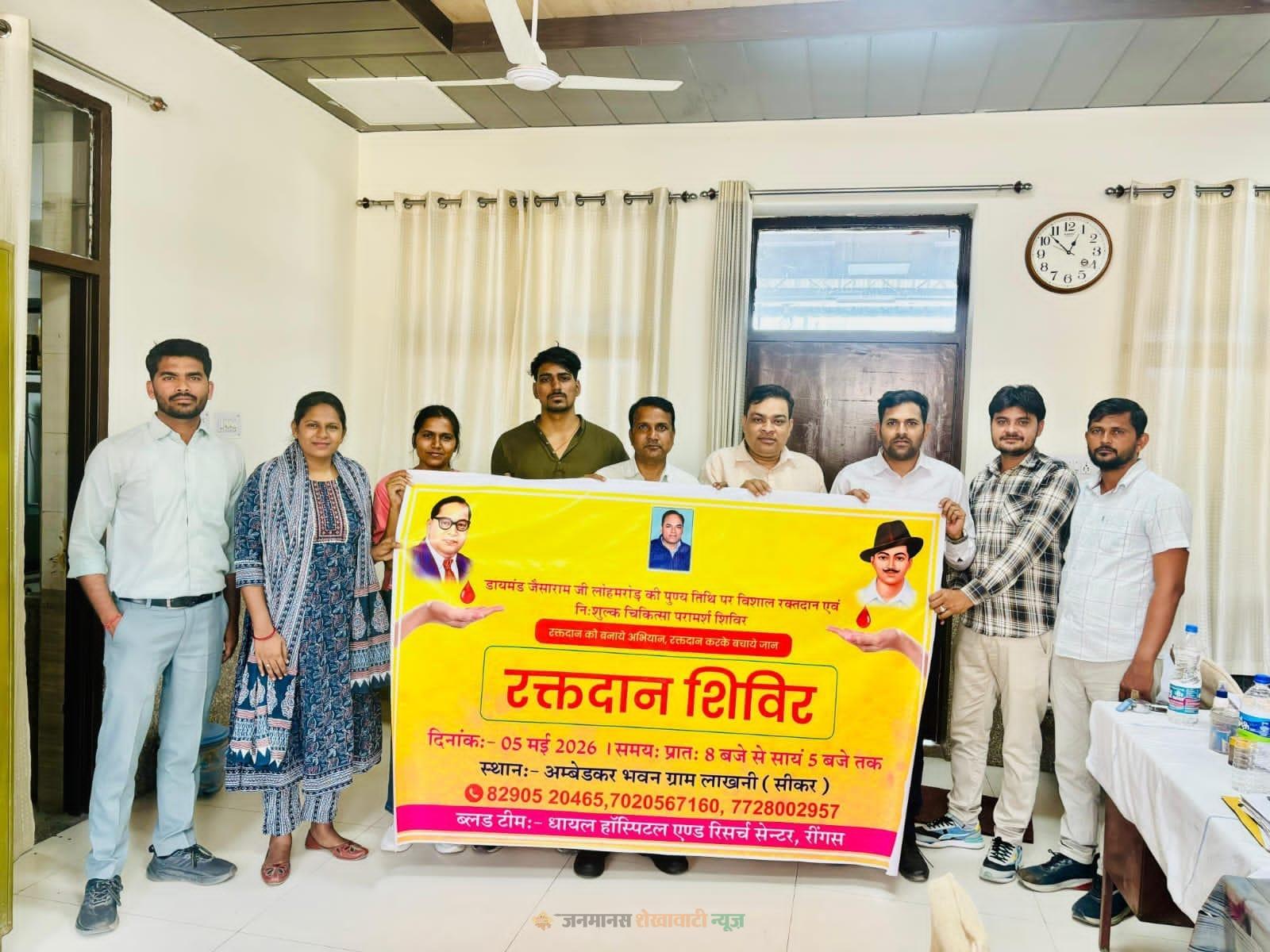 जाजोद : ग्राम पंचायत लाखनी में 5 मई को एक विशाल रक्तदान एवं निःशुल्क चिकित्सा परामर्श शिविर आयोजित किया जाएगा। यह शिविर डायमंड गुरु जैसाराम लोहमरोड़ की पुण्यतिथि के अवसर पर अम्बेडकर भवन लाखनी में होगा। आयोजक कर्नल एलसी वर्मा और अजय लोहमरोड़ ने बताया कि शिविर में धायल हॉस्पिटल के फिजिशियन, स्त्रीरोग और हड्डीरोग विशेषज्ञ अपनी सेवाएं देंगे। रक्तदान शिविर 5 मई को सुबह 8 बजे से शाम 5 बजे तक चलेगा। गुरुजी के पिता सुवालाल लोहमरोड़ ने आम जनता से शिविर में अधिक से अधिक संख्या में पहुंचकर इसका लाभ उठाने की अपील की है। हाल ही में शिविर के पोस्टर का विमोचन किया गया। पोस्टर विमोचन के दौरान अजय लोहमरोड़, आशुतोष, सानिया, मेघा, समता दल के अध्यक्ष श्यामलाल मेघवाल, महावीर और धायल हॉस्पिटल की टीम के सदस्य उपस्थित थे।