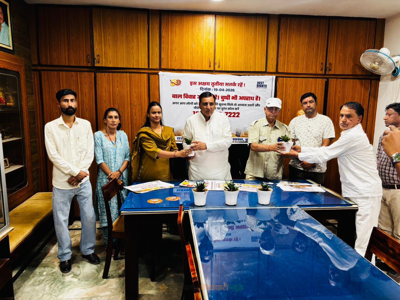चूरू : चूरू में अक्षय तृतीया के अवसर पर बाल विवाह रोकथाम के लिए सतर्कता दिवस मनाया गया। इस दौरान पूर्व नेता प्रतिपक्ष राजेंद्र राठौड़ के आवास पर विधायक हरलाल सहारण ने बाल विवाह रोकथाम संबंधी पोस्टर का विमोचन किया।