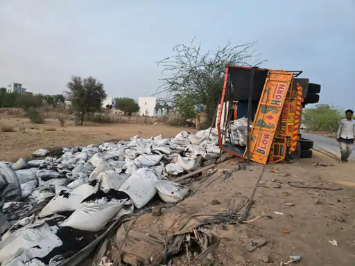 सरदारशहर के खेजड़ा मोड पर पलटा ट्रक:मेगा हाईवे पर हुआ हादसा, सड़क पर बिखरे कट्टे