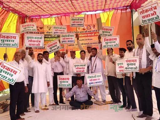 धरना प्रदर्शन और आक्रोश रैली के बाद, चुनाव करवाने की मांग को लेकर अतिरिक्त जिला कलेक्टर भगीरथ साख को चार सूत्रीय मांगों का ज्ञापन सौंपा गया। राजीव गांधी पंचायत राज संगठन के जिलाध्यक्ष बसंत कुमार यादव ने बताया कि संविधान के 73वें और 74वें संशोधन की भावना का क्षरण किया जा रहा है। उन्होंने कहा कि जब पांच वर्ष में चुनाव करवाना अनिवार्य है, उसके बावजूद करीब दो वर्ष बीत जाने के बाद भी चुनाव नहीं करवाए जा रहे हैं। देश में न तो कोई आपातकाल लगा है और न ही कोई अन्य कारण है।