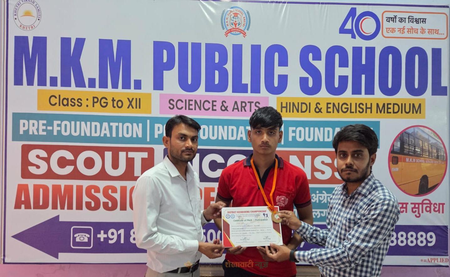 खेतड़ी : खेतड़ी विकास समिति द्वारा संचालित एम के एम पब्लिक स्कूल, राजोता के कक्षा 10 के छात्र रोहित कुमार ने जिला स्तरीय किक बॉक्सिंग प्रतियोगिता में शानदार प्रदर्शन करते हुए जूनियर 74 किलोग्राम भार वर्ग में गोल्ड मेडल जीतकर प्रथम स्थान हासिल किया।