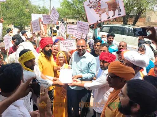 बुहाना : बुहाना कस्बे में गौ माता को राष्ट्र माता घोषित करने की मांग को लेकर एक रैली निकाली गई और तहसीलदार को राष्ट्रपति के नाम ज्ञापन सौंपा गया। यह कार्यक्रम टीम मीन जांगिड़ के नेतृत्व में आयोजित किया गया, जिसमें बड़ी संख्या में गौ सेवक, संत-महात्मा और स्थानीय नागरिक शामिल हुए।