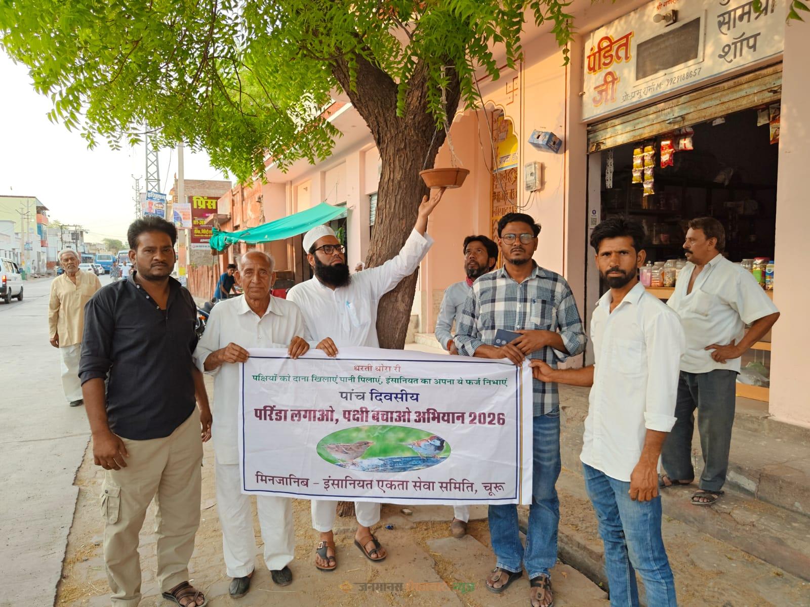 चूरू : जिला मुख्यालय पर इंसानियत एकता सेवा समिति की ओर से चल रहे पांच दिवसीय “परिंडा लगाओ, पक्षी बचाओ” अभियान का समापन केटीसी स्कूल सहित शहर में विभिन्न स्थानों पर परिंडे लगाकर किया गया। इस अवसर एडवोकेट इब्राहीम गौरी ने कहा कि इस भीषण गर्मी में बेजुबान पक्षियों के लिए दाने-पानी की व्यवस्था करना बड़ा नेक और सहरानीय कार्य है। समिति संस्थापक व अभियान संयोजक करामत खान उर्दू अदीब ने बताया कि अभियान के तहत शेखावाटी क्षेत्र में 511 से अधिक परिंडे लगाए गए,जिन स्थानों पर परिंडे लगाए गए, वहां समिति से जुड़े कार्यकर्ताओं को उनके सार-संभाल की दी गई।