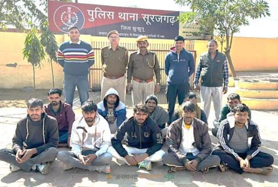 जिसमें जाखोद निवासी पवन सिंह पुत्र बजरंग सिंह, प्रवीण कुमार पुत्र सुभाष, धिंगड़िया के संदीप पुत्र बिहारीलाल, श्योराणों का बास का राजवीर पुत्र रामचन्द्र, सुमन देवी पत्नी संदीप निवासी खेदड़ो की ढाणी, बेरला के विवेक कुमार पुत्र रविन्द्र सिंह, बिशनपुरा से अंकित पुत्र छोटेलाल, लोटिया निवासी सोनु पुत्र रामेश्वर, कुलोठ कलां के नवीन कुमार पुत्र जयप्रकाश, पिपली से लोकेश पुत्र प्रदीप कुमार, भावठड़ी के मंदीप सिंह पुत्र रविन्द्र सिंह, दुदी के साहिल पुत्र अजित कुमार तथा किढ़वाना निवासी रमेश कुमार नेहरा पुत्र हरलाल को गिरफ्तार किया है।