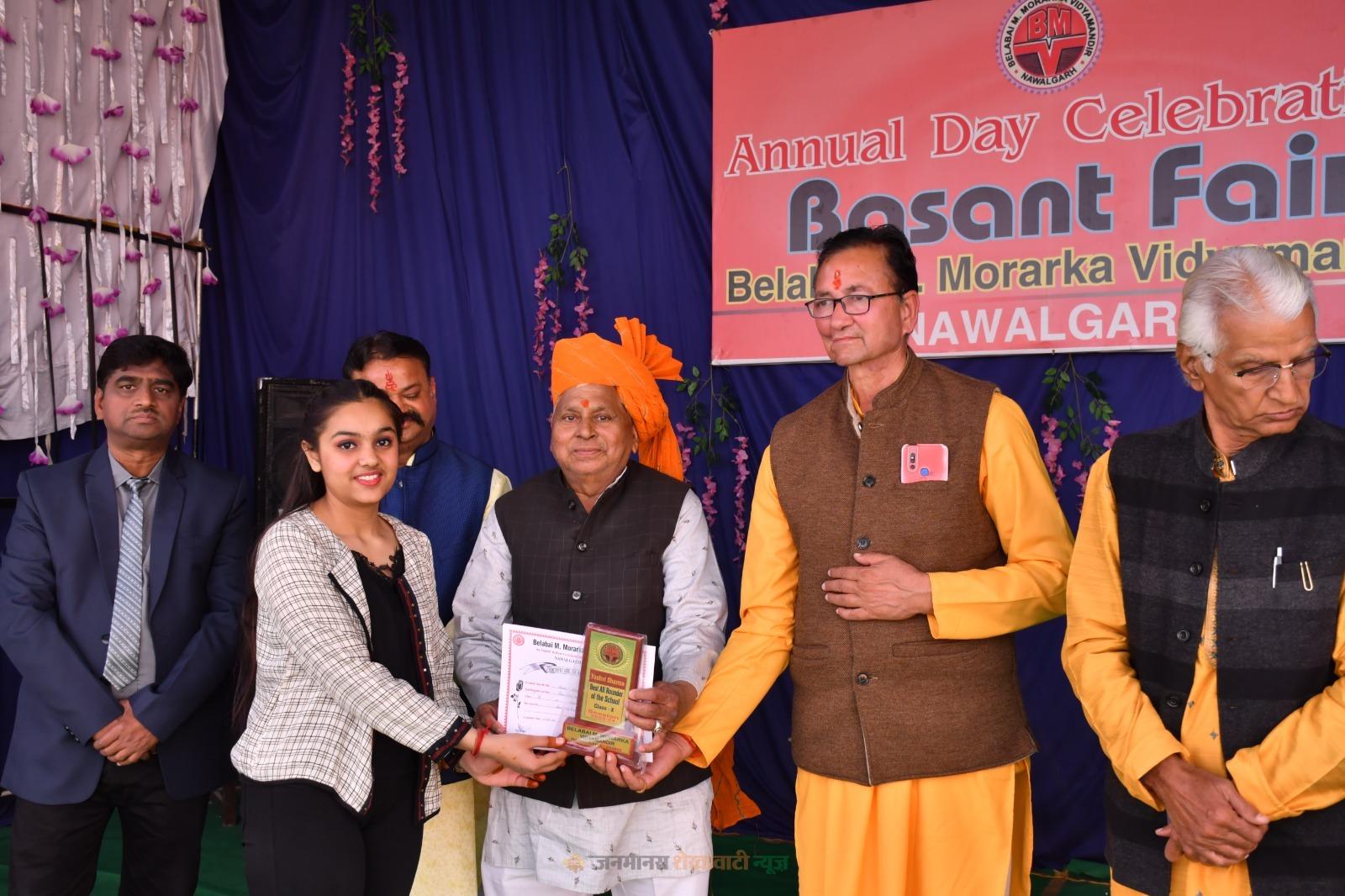 नवलगढ़ : कस्बे के बेलाबाई एम. मोरारका विद्या मंदिर में 26वां वार्षिक उत्सव में बसंत मेला धूमधाम से मनाया गया विद्यार्थियों द्वारा रंगारंग आकर्षित सांस्कृतिक कार्यक्रम की प्रस्तुति दी गई मुख्य अतिथि मुख्य अतिथि अशोक शर्मा सीबीओ द्वारा विद्या मंदिर छात्र छात्रों के श्रेष्ठ बोर्ड परीक्षा परिणाम हेतु स्मृति चिन्ह प्रदान कर समानित किया गया एवं विभिन्न गतिविधियों के पुरस्कार प्रदान किए गए कार्यक्रम की शुरुआत मां सरस्वती के सामने दीप प्रचलित कर की गई रून झुन बाजे घुघरा बंद बंद मिलके बने लहर बच्चों में पुलवाना शहीद दिवस पर शहीदो कि याद मे अपनी नाटक प्रस्तुति द्वारा श्रद्धांजलि अर्पित की गई शहीद भगत सिंह शहीद राजगुरु की फांसी के नाटक के प्रस्तुति राजस्थानी गुजराती कार्यक्रम भी प्रस्तुति किए गए अंत में ऑर्गेनिक फार्मिंग के महत्व को दर्शाते हुए भी जागरूकता कार्यक्रम प्रस्तुत किया गया। अंत में फाल्गुन के स्वागत में होली नृत्य प्रस्तुत किया गया कार्यक्रम के अंत में प्राचार्य मुकेश कुमार शर्मा ने सबको धन्यवाद ज्ञापित किया। स्वागत संस्था सचिव राजेंद्र कुमार शर्मा ने किया।