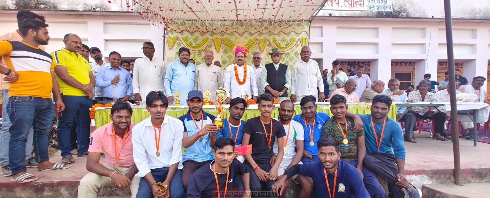 खेतड़ी : त्योंदा गांव में प्रतियोगिता का समापन किया गया जिस के मुख्य अतिथि मनोज घुमरिया रहे विशिष्ट अतिथि कर्नल सुल्तान सिंह और बहादुर सिंह, महावीर सिंह राजपूत, मुरारी लाल मितल रहे। फाइनल मैच स्टार इलेवन त्योंदा और जय महामाल महाराज त्योंदा के बीच खेला गया इसमें जय महामाल महाराज 27 रन से विजय रहा जिसमें कुल 32 टीमों ने भाग लिया विजेता टीम को 11000 हजार रूपये और उप विजेता को 7100 रूपये मनोज घुमरिया ने भेंट किए। आयोजककर्ता सत्येंद्र कुमार और अजय भार्गव ने बताया स्टेज का संचालन सीताराम और किशन ने किया और गणमान्य लोगों में सुगन सिंह राजपूत, गजराज सिंह, भूतपूर्व डेलीगेट रामवतार सिंग, विनोद सेठ, दीपक, प्रकाश, सत्तू कटारिया, शकूर खान, सफी खान, आरिफ खान, लक्ष्मण, बलबीर छापोला, शिव कुमार, रामकिशन राजपूत ढाना ।