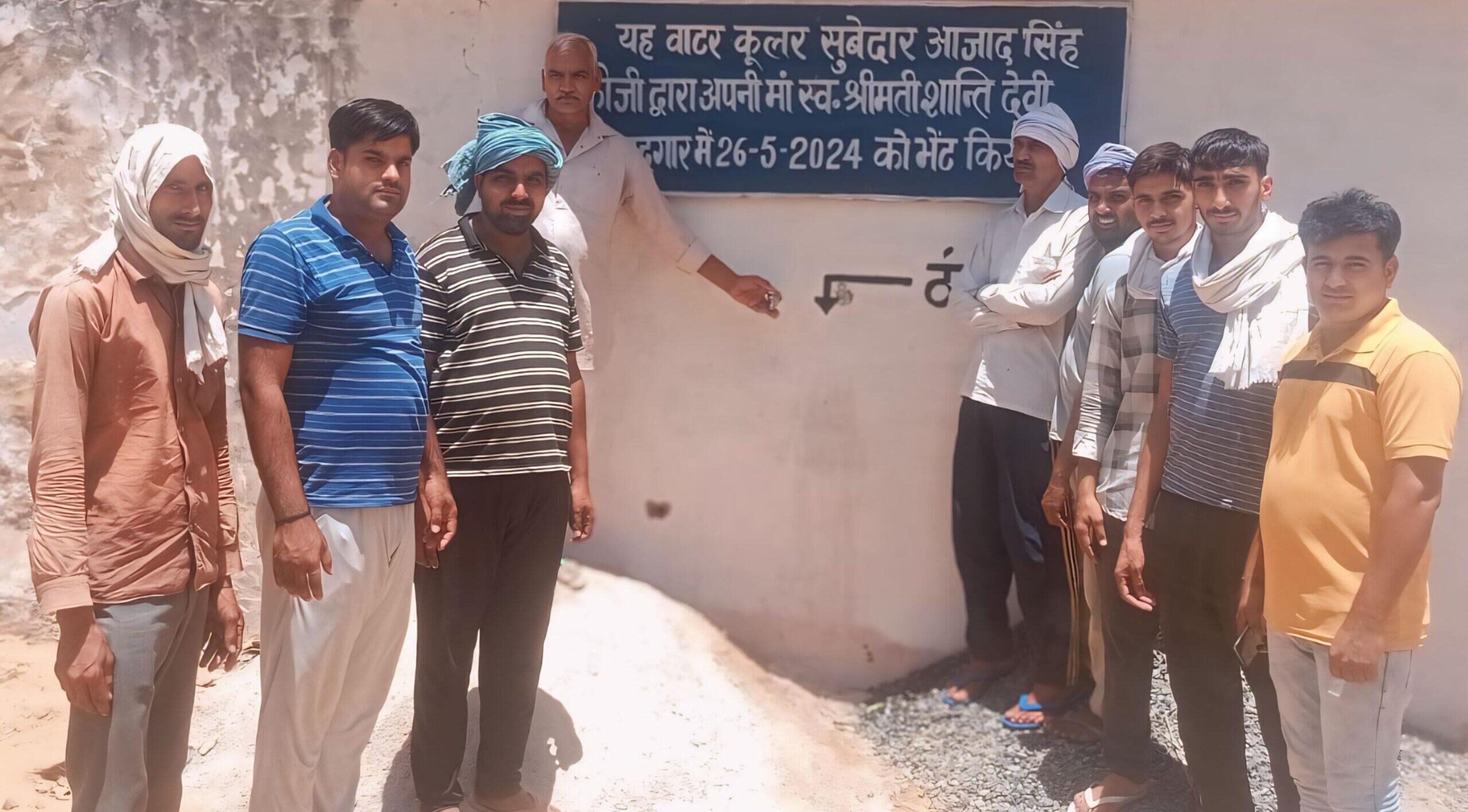 सूरजगढ़ : वीर तेजाजी विकास संस्थान के अध्यक्ष जगदेव सिंह खरड़िया ने बताया कि सूबेदार आजाद सिंह फौजी ने भीषण गर्मी को देखते हुए ठंडे पानी के लिए अपनी मां स्व. शान्ति देवी की स्मृति में वाटर कूलर लगवाया । उनके सुपोत्र अमन लोहान ने उदघाटन किया। इस दौरान दफेदार भूप सिंह, सोसाइटी अध्यक्ष महेश लोहान, विक्रम उर्फ भज्जी लोहान, सुरेन्द्र (चौटाला), संजय लोहान, ओमप्रकाश भास्कर, टीनू लोहान, बिंदु लोहान, रविप्रकाश नायक, कुलदीप उर्फ लाभा, मयंक झाझडिया आदि मौजूद थे ।