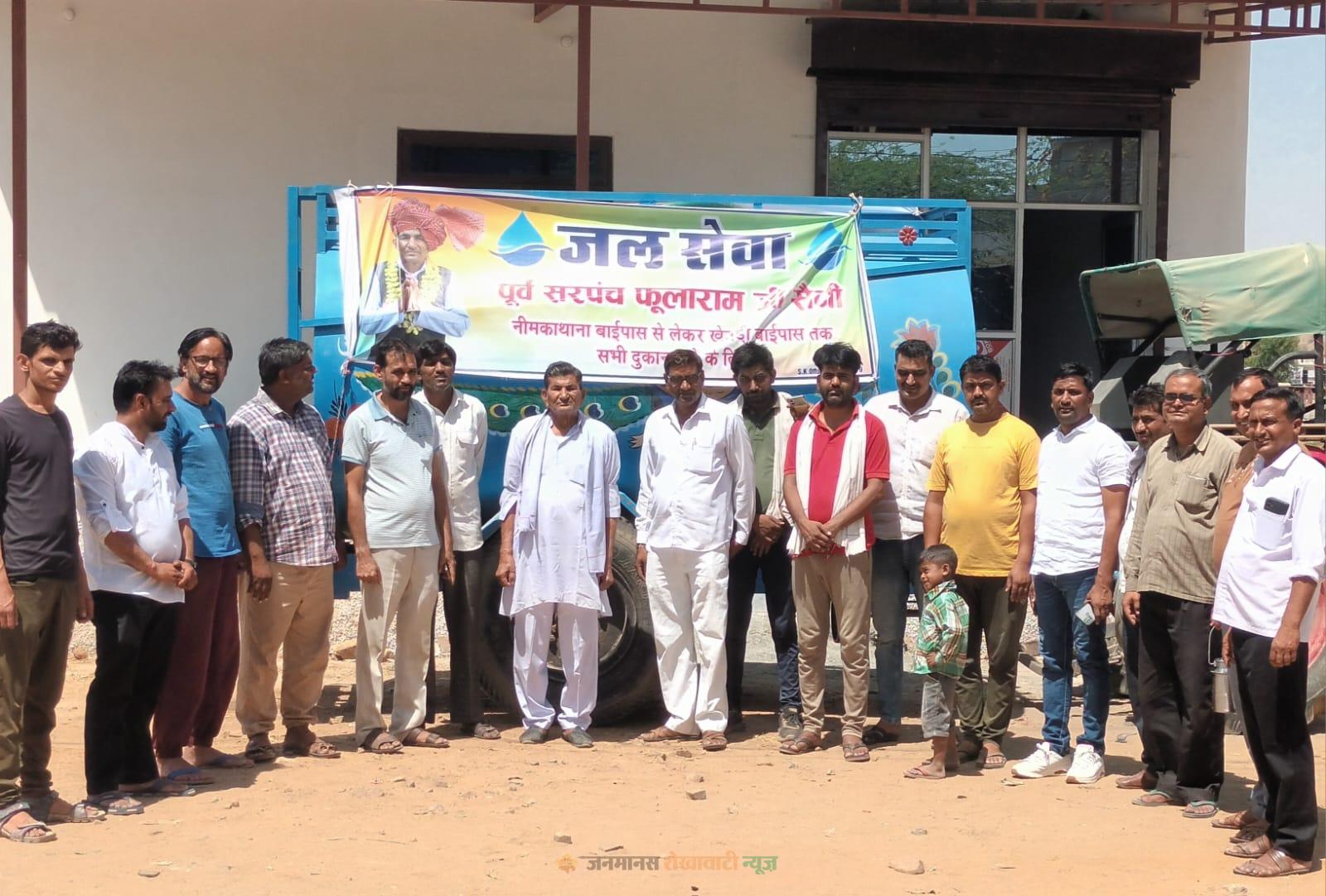 खेतड़ी : राजस्थान में हिटवे व तेज गर्मी को देखते हुए खेतड़ी उपखण्ड क्षेत्र के ग्राम बबाई में पूर्व सरपंच फूलाराम सैनी ने पहल करते हुए खेतड़ी बाईपास से लेकर नीमकाथाना बाईपास तक के सभी व्यवसायिक प्रतिष्ठानों पर पानी के टैंकर द्वारा पानी डलवाया गया। इससे पहले पूर्व सरपंच फूलाराम सैनी ने टैंकर को हरी झंडी दिखाकर रवाना किया। इस मौके पर पूर्व सरपंच फूलाराम सैनी ने कहा कि तेज गर्मी को देखते हुए उनके द्वारा प्रतिदिन बबाई की प्रत्येक प्रतिष्ठानों पर पीने व कुलर भरने के लिए दो टैंकर पानी सप्लाई की जाएगी। इस मौके पर सुरेश कुमावत, प्रकाश सैन, मोसिन ख़ान, असलम, दलिप चौधरी, नेतराम जांगिड़, बालसिंह सैनी, राकेश गुर्जर, मुकेश कप्तान, हरपाल ठेकेदार, भंवर सिंह सैनी, राकेश कुमार, नन्दराम सैनी सहित अनेक लोग मौजूद थे।