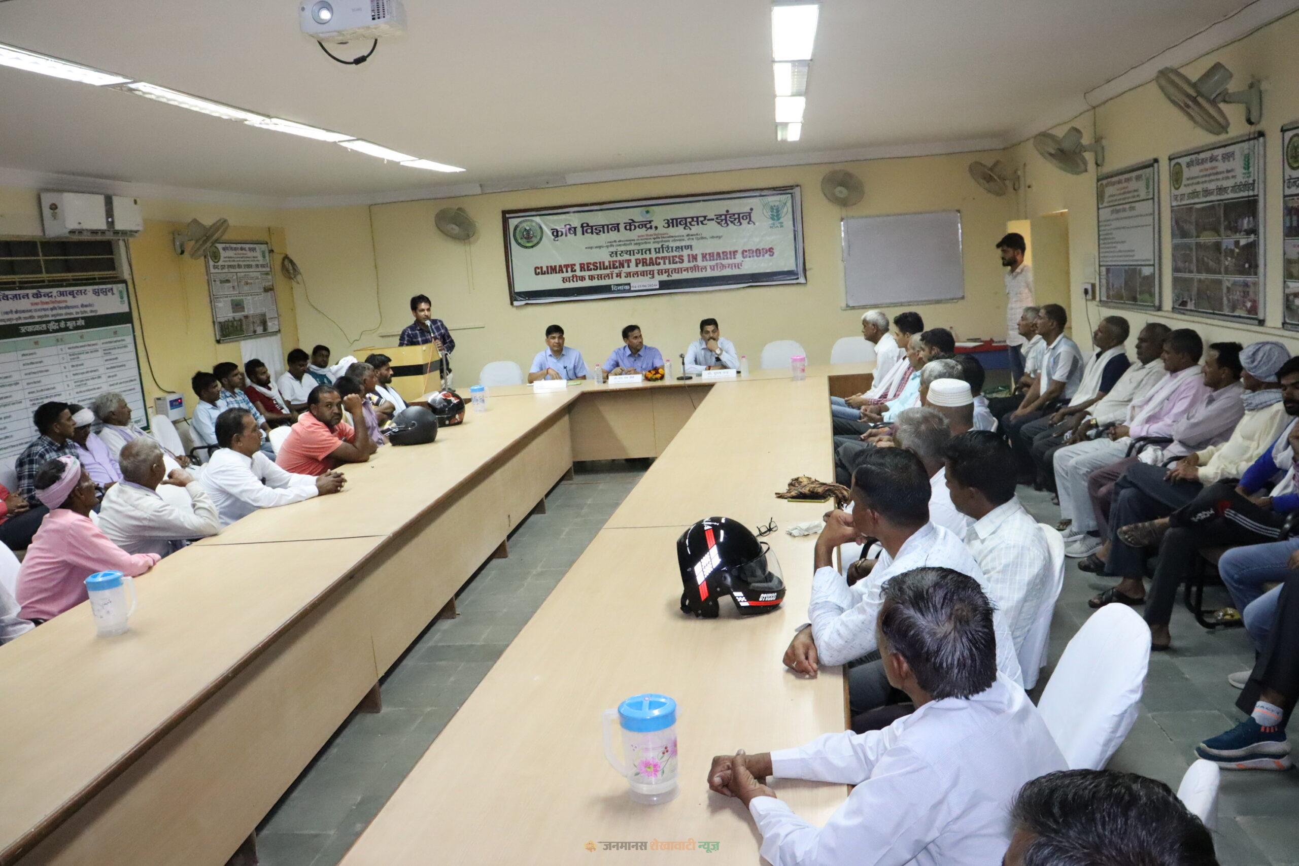 आबूसर (झुंझुनूं) : कृषि विज्ञान केंद्र आबूसर झुंझुनूं पर 14-15 जून 2024 को दो दिवसीय जलवायु स्मूत्थानशील कृषि विषय पर संस्थागत प्रशिक्षण का आयोजन किया गया इस प्रशिक्षण में बतौर मुख्य अतिथि डॉ देवाराम सैनी कुलसचिव एवं डॉ सुभाष चंद्र निदेशक प्रसार शिक्षा स्वामी केशवानंद राजस्थान कृषि विश्वविद्यालय बीकानेर उपस्थित रहे। कृषि विज्ञान केंद्र के वरिष्ठ वैज्ञानिक एवं अध्यक्ष डॉ दयानंद ने बताया की कृषि विज्ञान केंद्र द्वारा ग्राम भारू चकवास एवं मदनसर जलवायु स्मूत्थानशील कृषि पर राष्ट्रीय नवाचार परियोजना चलाई जा रही है जिसके तहत फसलों की जलवायु स्मूत्थानशील किस्मों एवं विभिन्न तकनीकों का प्रदर्शन किया जाता है। डॉ दयानंद ने बताया कि यह परियोजना वर्ष वर्ष 2011-12 से चल रही है कार्यक्रम के मुख्य अतिथि डॉ देवाराम सैनी ने कृषि विज्ञान केंद्र आबूसर झुंझुनूं द्वारा किए जा रहे नयाचारों की प्रशंसा की एवं किसानों को लगातार कृषि विज्ञान केंद्र के संपर्क में रहने की सलाह दी जिससे उन्नत तकनीकों को कृषि में उपयोग किया जा सके। निदेशक प्रसार शिक्षा स्वामी केशवानंद राजस्थान कृषि विश्वविद्यालय बीकानेर डॉ सुभाष चंद्र ने किसानों से विभिन्न नवाचारों के बारे में फीडबैक लिया तथा कृषि विज्ञान केंद्र के वैज्ञानिकों को स्मूत्थानशील कृषि तकनीक को वृत्त स्तर पर प्रदर्शित करने का सुझाव दिया। कार्यक्रम में किसानों को फसलों की जलवायु स्मूत्थानशील किस्मों का बीज भी वितरित किया गया इस कार्यक्रम में केंद्र के उद्यान विशेषज्ञ डॉ रशीद खान, डॉ प्रदीप कुमार, अभिषेक कुमार, रमन मीणा एवं लगभग 70 प्रगतिशील किसानों ने भाग लिया.