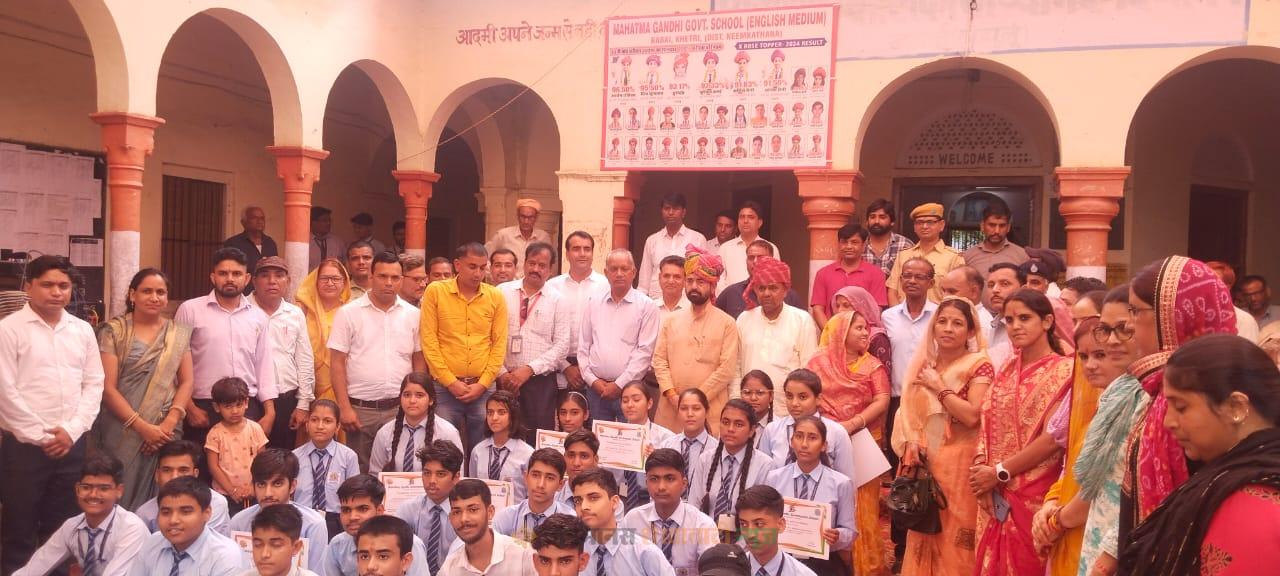 बबाई : राजकीय महात्मा गांधी विद्यालय में हुआ प्रतिभा सम्मान समारोह का आयोजन नीमकाथाना जिला शिक्षा अधिकारी राधेश्याम शर्मा की अध्यक्षता में मनाया गया। कार्यक्रम के मुख्य अतिथि विधायक इंजीनियर धर्मपाल गुर्जर थे। खेतड़ी ब्लॉक शिक्षा अधिकारी जितेंद्र कुमार सुरीलिया, ग्राम सरपंच मैना देवी, पंचायत समिति सदस्य नौरंगी लाल सैनी विशिष्ट अतिथि थे।