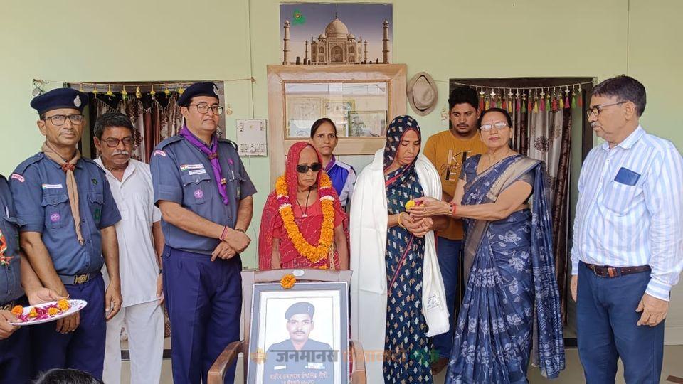 झुंझुनूं : जिला प्रशासन के निर्देश की अनुपालना में राजस्थान राज्य भारत स्काउट गाइड जिला मुख्यालय झुंझुनूं एवं शिक्षा विभाग झुंझुनूं के संयुक्त तत्वावधान में मुख्य जिला शिक्षा अधिकारी अनसूईया सिंह के नेतृत्व में शहीद इंद्र सिंह सैनी के घर पहुंच कर स्काउट गाइड एवं शिक्षा विभाग के पदाधिकारियों ने शहीद इंद्र सिंह सैनी की वीरांगना पत्नी शारदा देवी का शाल ओढ़ाकर एवं माला पहनाकर अभिनंदन एवं स्वागत किया गया, साथ ही शहीद की माताजी चावली देवी का भी स्वागत अभिनंदन किया गया।