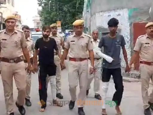होटल पर फायरिंग के आरोपियों की पुलिस ने कराई परेड:दोनों को नंगे पैर बाजार में घुमाया, हरियाणा से किया था गिरफ्तार