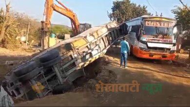 खेतड़ी में पुल निर्माण स्थल पर बड़ा हादसा: 30 फीट लंबा कंटेनर पलटा, दो मजदूर बाल-बाल बचे