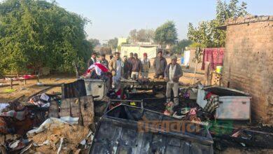 सरदारशहर के बधनाऊ दिखनादा में शॉर्ट सर्किट से लगी आग:खेत पर बनी किसान की ढाणी में लाखों का नुकसान, मुआवजे की मांग
