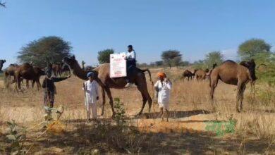 जसरापुर में ऊंट पर बैठकर मंगला पशु बीमा का प्रचार:पशु चिकित्सक ने टोले संग गांव-गांव बताई पंजीकरण प्रक्रिया, अधिकतम 10 ऊंटों का बीमा करवा सकेगा