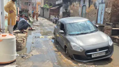 श्रीमाधोपुर में बारिश से धंसा सीवरेज गड्ढा, कार फंसी:मीणा चौक पर काम रुका, यात्रियों को हो रही परेशानी
